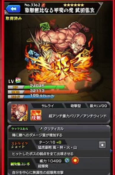 武田信玄友クリじゃ無かったか。ステもいくら超重力あると言えどそのスピードなら攻撃力もう少し欲しかったかな。